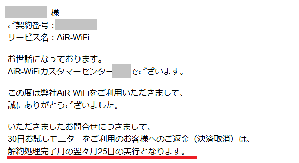 先程もご説明しましたが、解約申請を行った際、「1ヶ月お試しモニターによるご解約」を選択してますので、解約が受理されれば、初期費用は返還されるはずです。