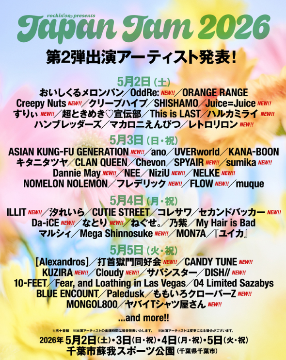 JAPAN JAM 2026の第2弾出演アーティストは、2026年2月4日に公式サイトおよびSNSで発表されました。