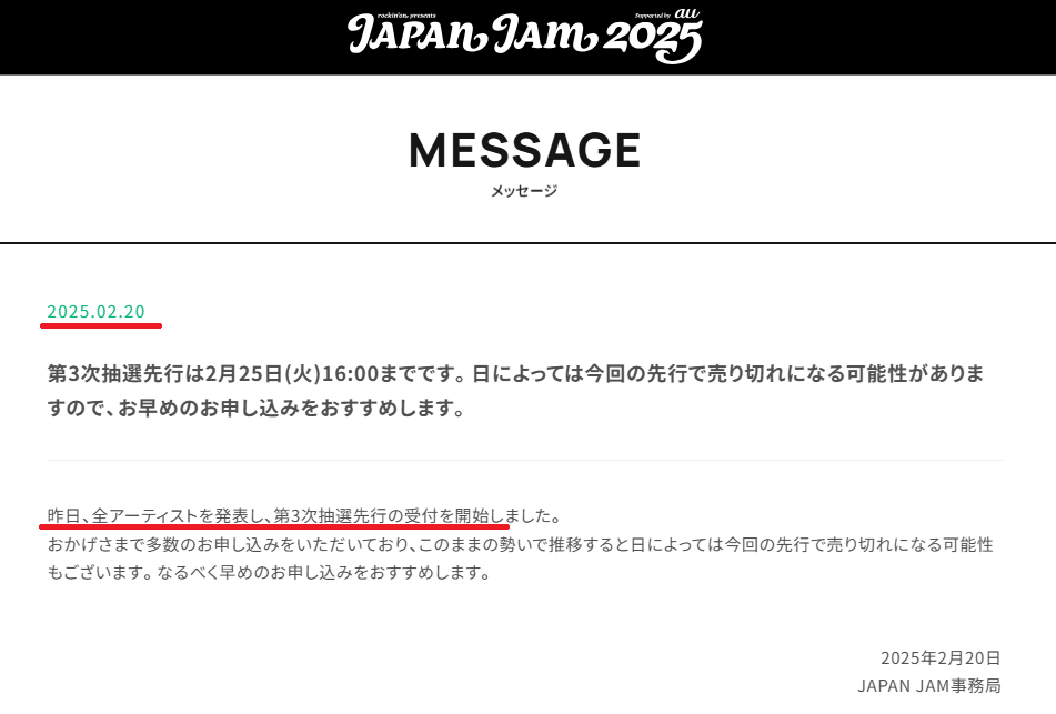 私自身も、昨年の「JAPAN JAM 2025」と「ROCK IN JAPAN 2025」で、”全出演アーティストが揃う、第3弾が発表されてから、抽選に申し込もう” と思って、申し込んだところ、どちらも、抽選に落ちるという目にあいました。