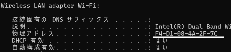 - MACアドレスは、コマンドプロンプトから「ipconfig /all」→ F4:D1:08:4A:2F:7C