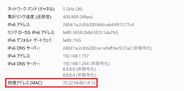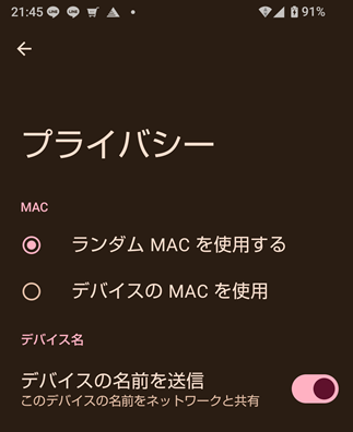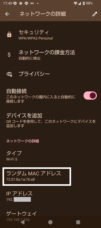現在接続しているSSIDネットワークの詳細を開くと、「ランダムMACアドレス」が確認出来、デバイスとは違うMACアドレスが割り当てられている事が分かります