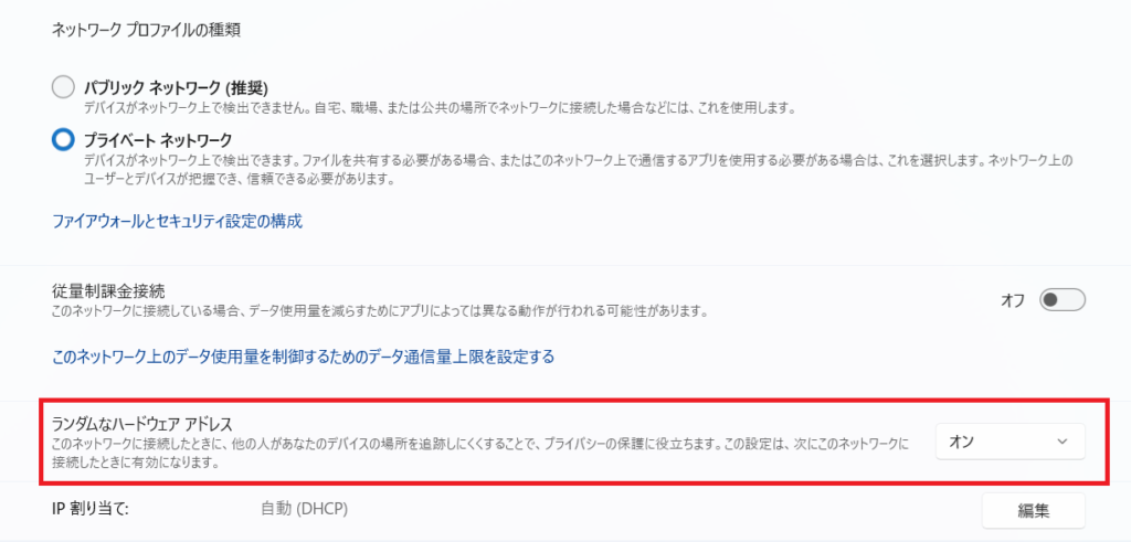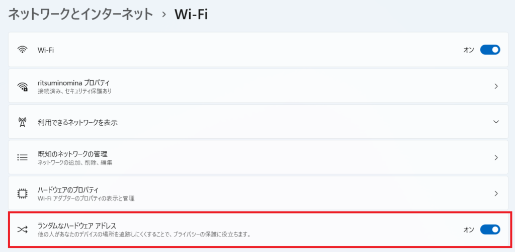 もちろん、現在サポートOSであるWindows 11でもMACアドレスランダム化は導入されています。