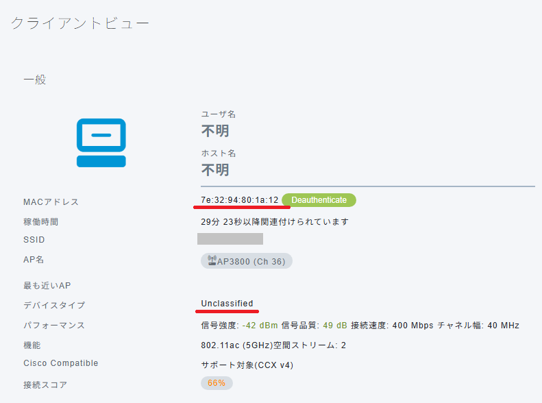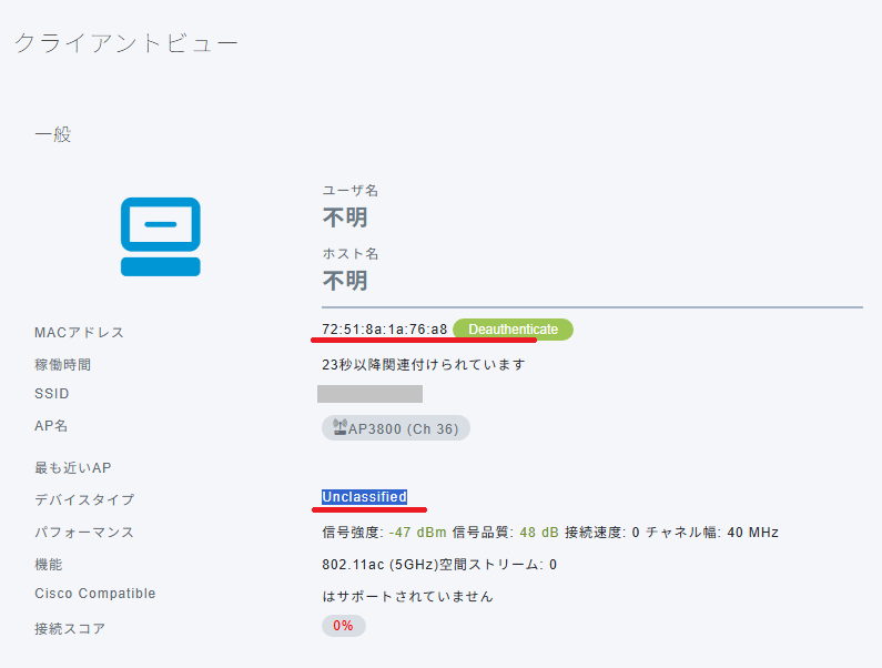 Aironet 3800の管理画面から確認すると、ランダムMACアドレスを使用して接続されている事が分かり、デバイスライプが「未分類」となっていることが分かりました