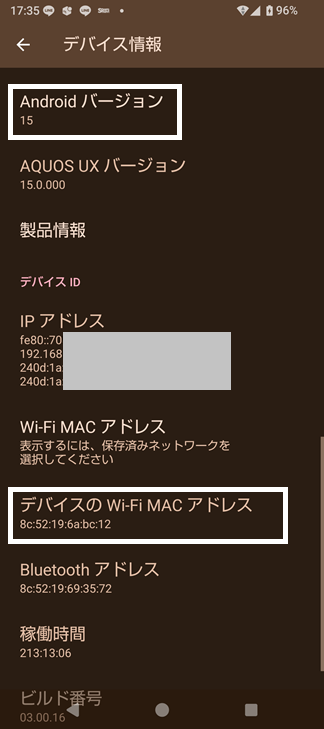 1-1.AQUOS Sense 8の「OSバージョン」と「MACアドレス」