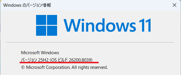 - OSバージョンは、「ファイル名を指定して実行」-「winver」→ Windows11 25H2