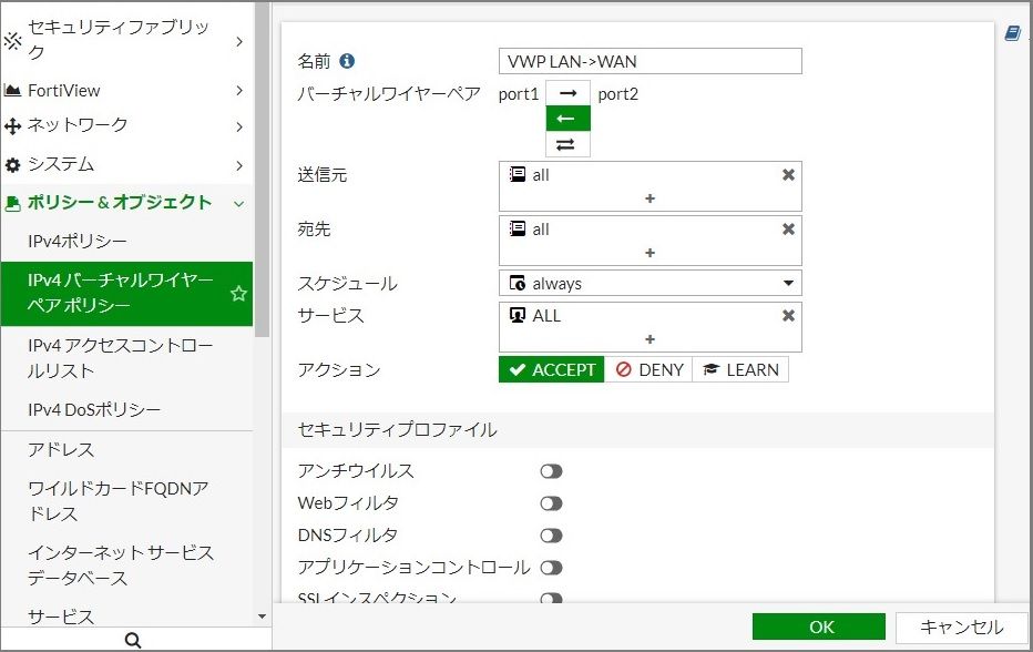 ・「ポリシー&オブジェクト」-「IPv4バーチャルワイヤーペアポリシー」-「新規作成」を選択し、以下情報を入力し、OKをクリック