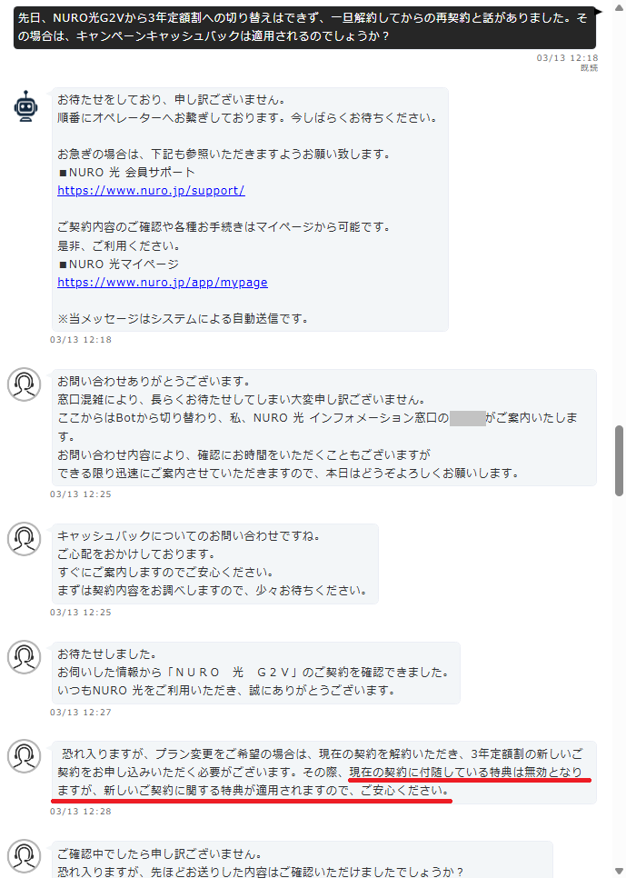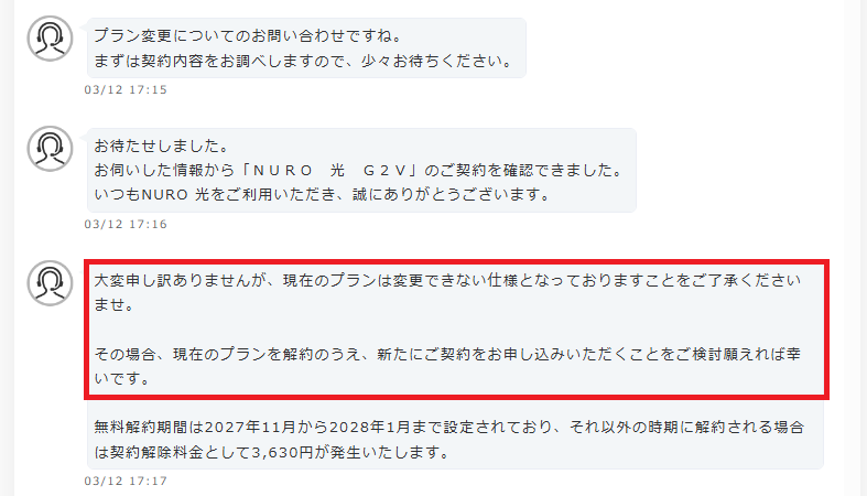 詳細なチャットのやり取りは以下になります。NUROオペレーターさんの回答からも、プラン変更ができない事が分かります。