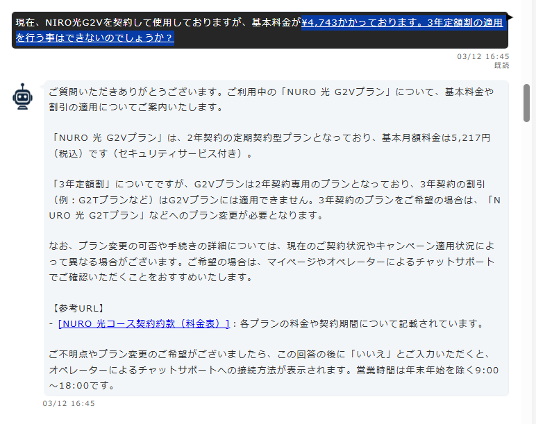 という思いもあり、実際に「NURO光チャット問い合わせ」を行いました。