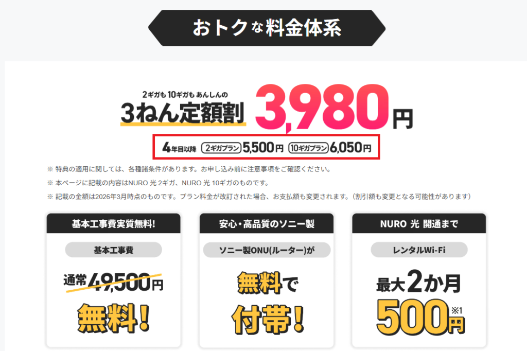NURO光のページを良く確認してみると、4年目以降の料金が表示されていますが・・
