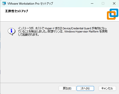 3.ここで、私のWindows 11 PCには「Hyper-v」がインストールされている為以下画面が表示